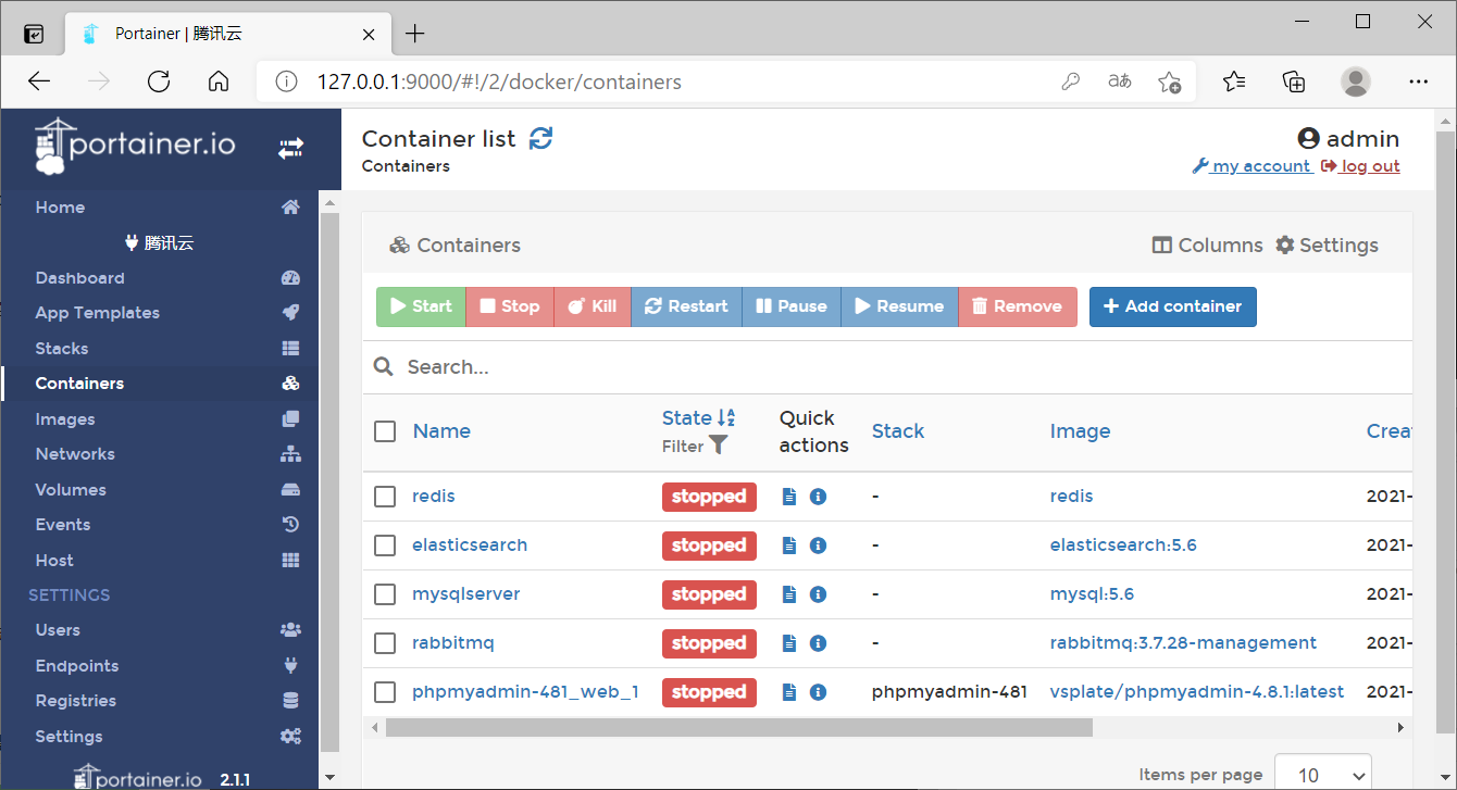 在上图中可以看到容器列表中存在两个容器,以及容器的运行状态,也可以对这些容器进行控制。