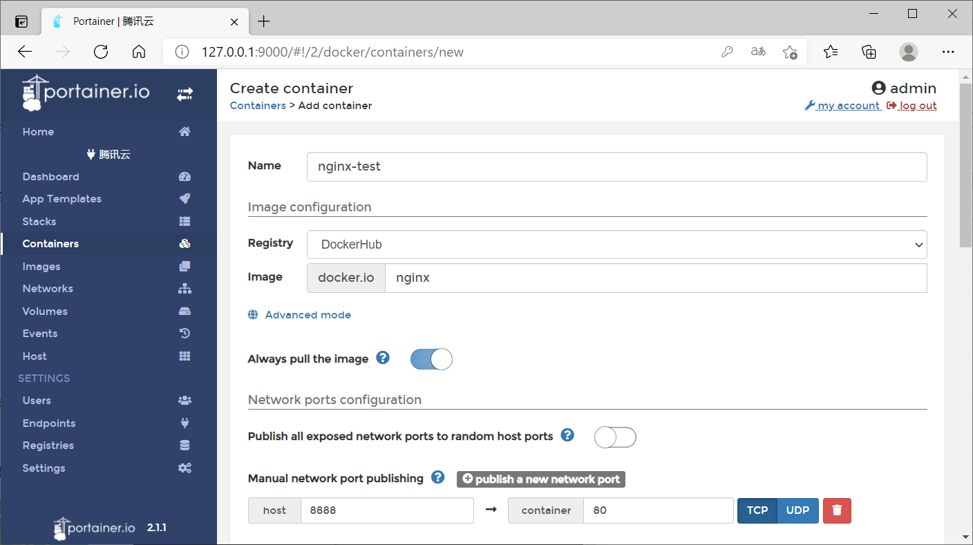 在上图所示的页面中,需要将docker镜像地址填写进去,这里我随意选举了一个nginx镜像,并且将主机的8888端口映射到了容器的80端口,提交这些信息之后,Portainer系统会告知你容器运行是否成功,如下图所示