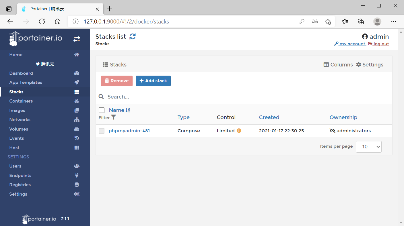除了在容器列表页部署容器之外,Portainer系统还支持使用docker-compose的方式进行部署,在Portainer系统中叫做stacks,在菜单栏中选择此项,可以进入docker-compose服务的列表,如下图所示