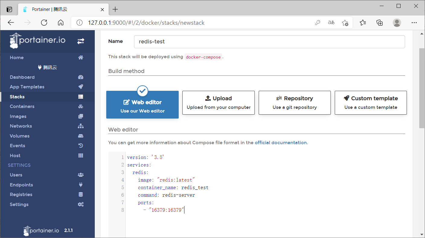 在上图所示的页面中,会要求我填写docker-compose的信息,这里我准备了一个Redis服务的docker-compose的配置,配置代码如下所示