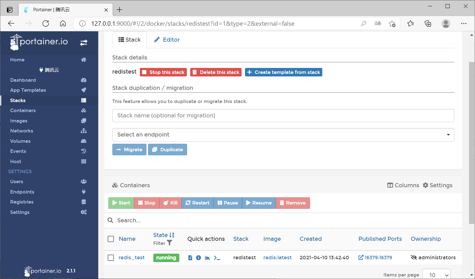 部署成功之后,可以在stacks列表中看到刚才部署的服务,你还可以点击列表中的服务名称,进入详情页进行查看和修改,如下图所示