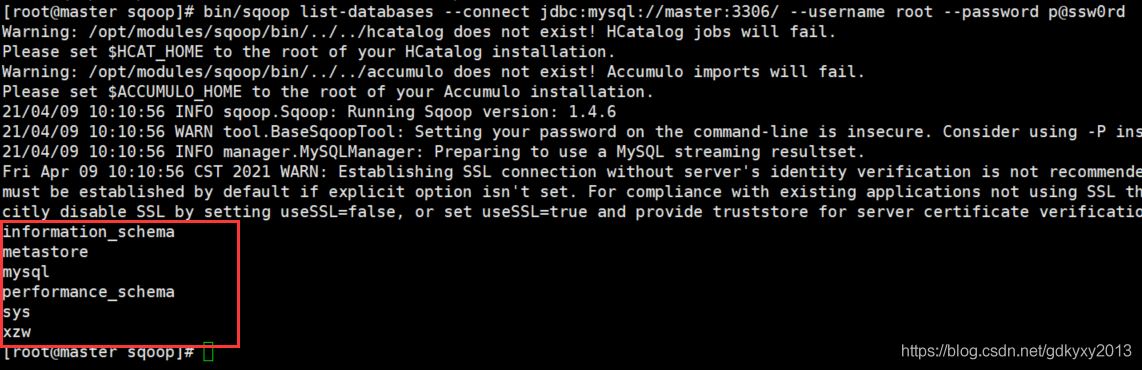 bin/sqoop list-databases --connect jdbc:mysql://master:3306/ --username root --password p@ssw0rd