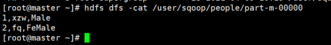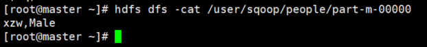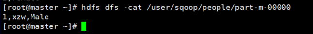 bin/sqoop import \ --connect jdbc:mysql://master:3306/xzw \ --username root \ --password p@ssw0rd \ --table people \ --target-dir /user/sqoop/people \ --delete-target-dir \ --num-mappers 1 \ --fields-terminated-by ","