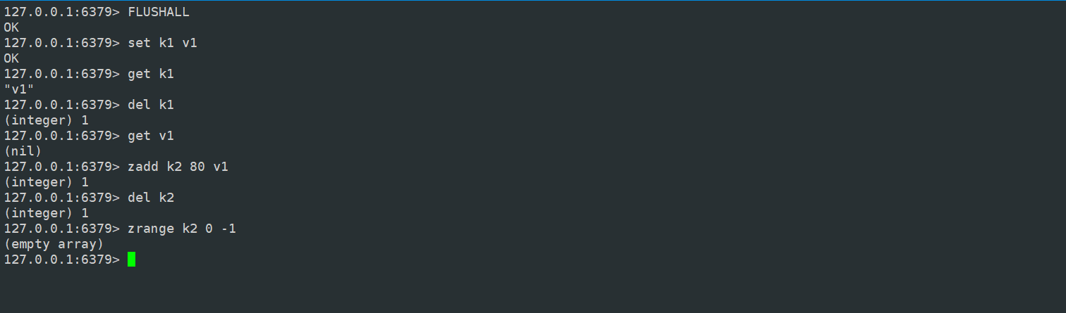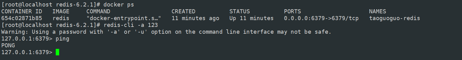 确保容器正在运行后,可以从宿主机上连接(前提是宿主机上存在 redis-cli),因为第一种编译安装方式我们已经在宿主机上安装了redis 所以可以直接使用宿主机的命令行工具