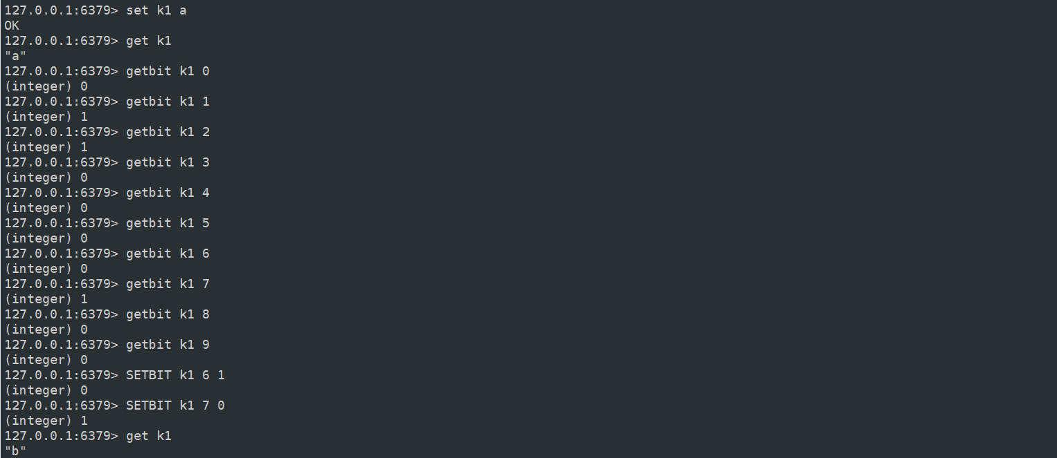 在 Redis 中,字符串都是以二进制的方式来存储的。例如 set k1 a,a 对应的 ASCII 码是 97,97 转为二进制是 01100001,BIT 相关的命令就是对二进制进行操作的。