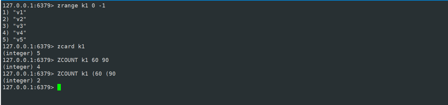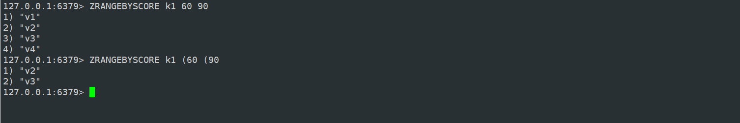 返回 score 在某一个区间内的元素,默认是闭区间,如果要开区间 在 score值 前面加上 (