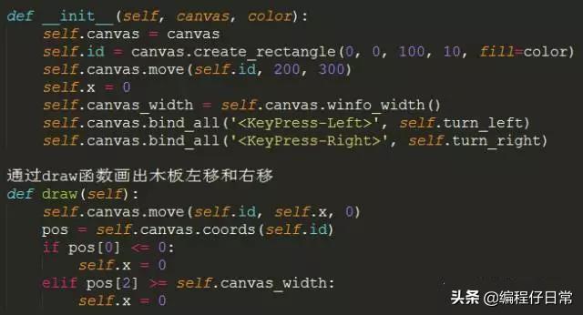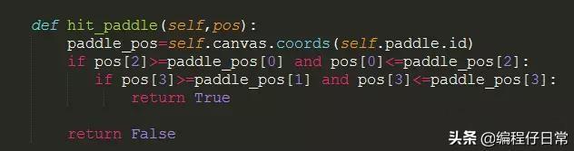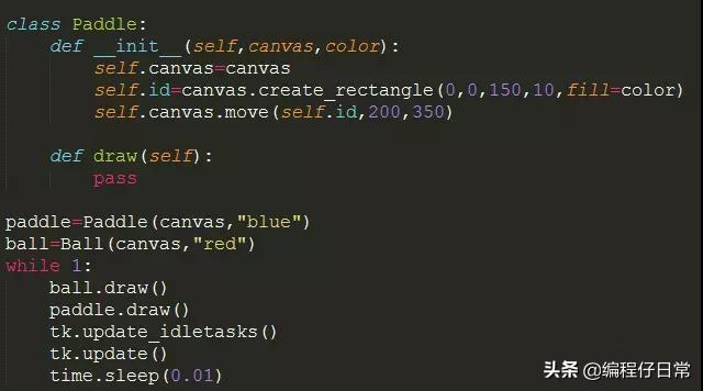 class Ball(): def __init__(self,canvas,paddle,color): --snip-- self.hit_bottom=False def draw(self): --snip-- if pos[3]>=self.canvas_height:#判断当球的下沿大于等于主界面的高度 self.hit_bottom=True --snip-- paddle=Paddle(canvas,"blue") ball=Ball(canvas,paddle,"red") while 1: if ball.hit_bottom==False and ball.paddle.started : ball.draw() paddle.draw() tk.update_idletasks() tk.update() time.sleep(0.01)