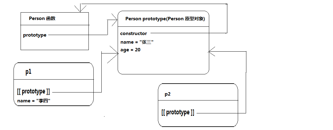 alert(p2.name); // 张三 都是从原型中找到的,所以一样。