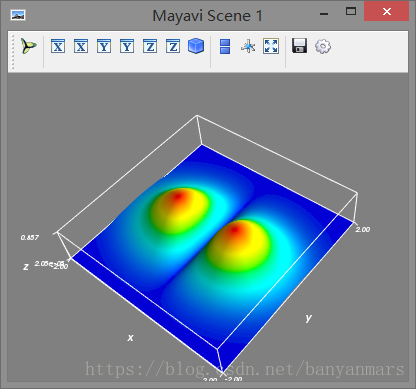 import numpy as np from mayavi import mlab x, y = np.ogrid[-2:2:160j, -2:2:160j] z = abs(x) * np.exp(-x ** 2 - (y / .75) ** 2) pl = mlab.surf(x, y, z, warp_scale=2) mlab.axes(xlabel='x', ylabel='y', zlabel='z') mlab.outline(pl) mlab.show()