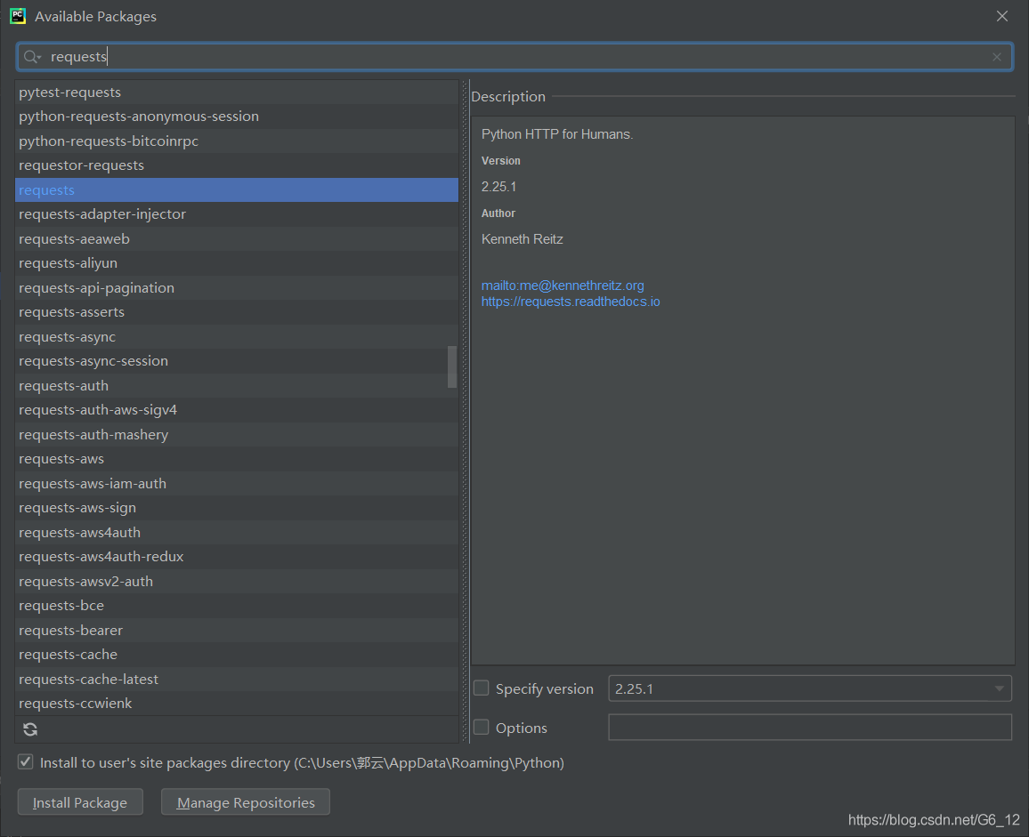 点击对话框下面的 + 号,在输入框输入想要安装的第三方库,我们这里安装requests库