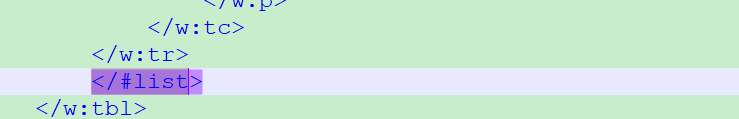 因为第一行是字段说明不可变,第二行是可变参数,根据List的多少而改变的,可在word_mode.ftl中添加<#list></#list>标签,如图5(开头),图6(结尾)