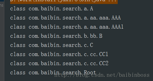 我故意创建了这么个比较复杂的项目结构,现在我们就来获取com.baibin包下所有的类,并且打印他们,代码如下: