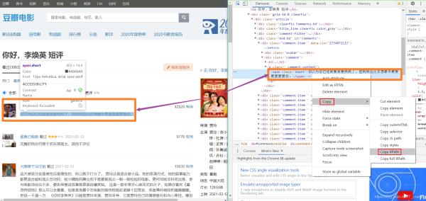 F12键进入开发者工具,并确定数据提取位置,copy其中的XPath路径