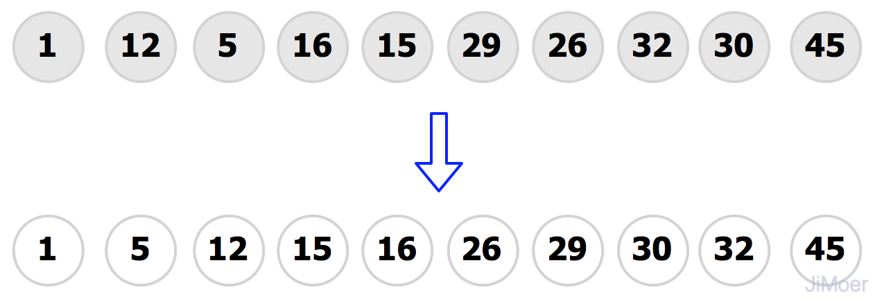 经过初始增量gap=array.length/2=5分组后,将原数据分为了5组,[12,1]、[29,30]、[5,45]、[16,26]、[15,32]。