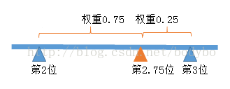 第2.75位介于第2位和第3位之间,距离哪位较近,哪位数据的权重较大,所以第3位数据的权重是0.75,第2位数据是