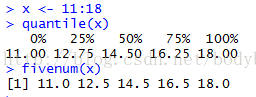 quantile()和fivenum()的本质差别在于, quantile()函数的算法是采用加权平均, fivenum()是算术平均。这么说可能不易理解,其实很简单的,下面举个例子说明就容易理解了。