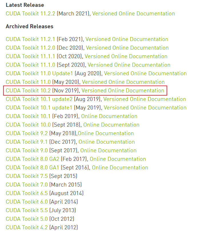要下载之前版本的CUDA在上述下载页面下滑 然后点击 ”CUDA早期版本档案”