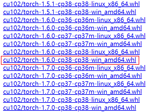 应下载 cu102/torch-1.6.0-cp38-cp38-win_amd64.whl