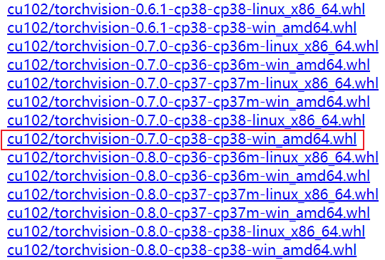 应下载 cu102/torchvision-0.7.0-cp38-cp38-win_amd64.whl