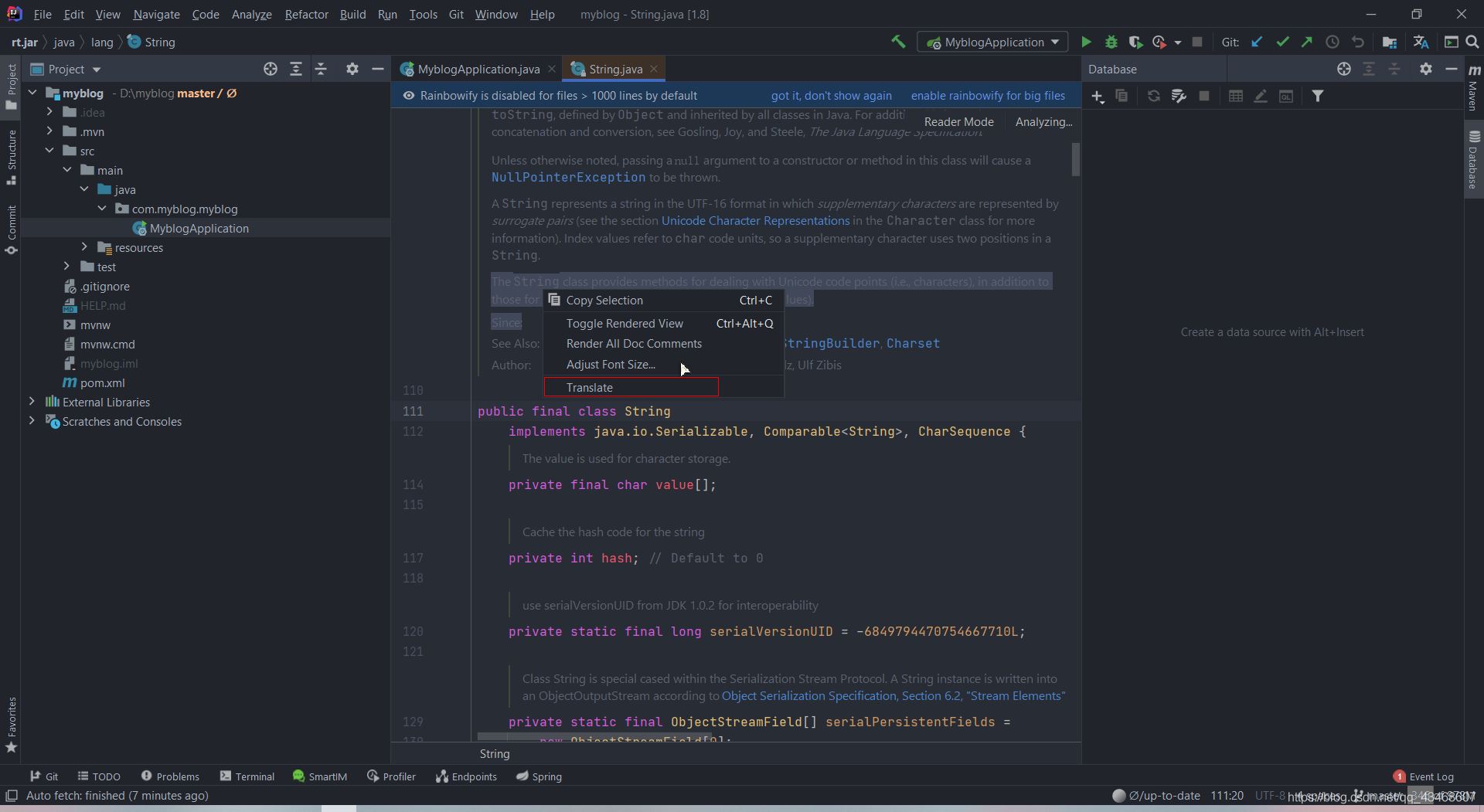 另外一款翻译插件不可错过,国产的翻译插件好用到不行,需要翻译jar包源代码注释,直接右击,translate,中文看起来特别爽