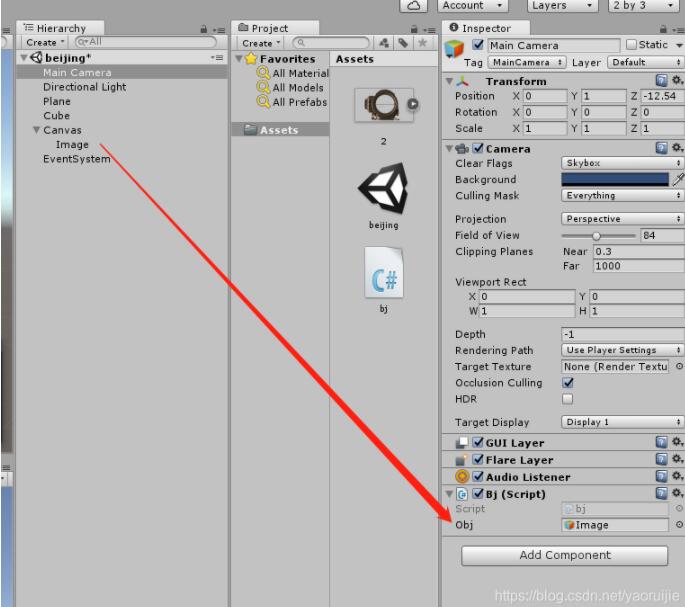 将代码挂载在main camera上,并将Image拖拽到代码中的obj上