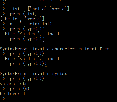 另一个需要注意的是,因为是列表,打印出来会带着“['']”,就很烦,不是我想要的命令那种一体化的,所以在这里我又查找到了join方法,属于列表常用方法,就是新建字符串(我特意看了下类型,下面有图说明),让字符串赋值:列表,并改变列表的分隔符(默认是单引号加逗号)为join前面单引号内的参数(可以为空None)。