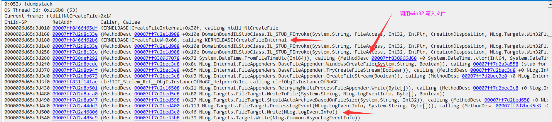 0000006d65d3d238 00007ff7d2d8c33e [InlinedCallFrame: 0000006d65d3d238] NLog.Internal.Win32FileNativeMethods.CreateFile(System.String, FileAccess, Int32, IntPtr, CreationDisposition, NLog.Targets.Win32FileAttributes, IntPtr)