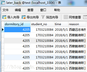else sql = "select * from later_back where student_no like '%" + laterBack.Student_no + "%' and time like '%" + laterBack.Time
