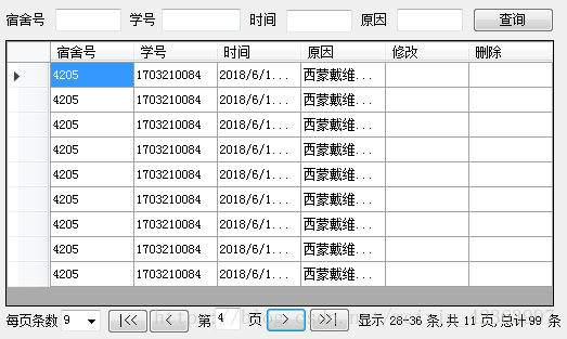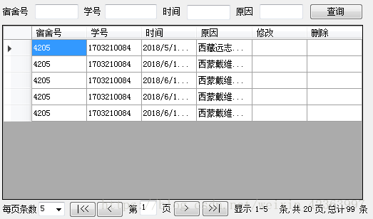 实现分页时,我的思想是,在每次查询时得到一个dataset1,然后在分页时根据一个from_index和一个end_index去得到当前页面要显示的dataset2,用dataset2来刷新当前要显示的数据,然后在dataset2里头支持行数据的修改与删除,可能从这么写不大合适,但是能完成分页的功能,仅供参考。源码如下: