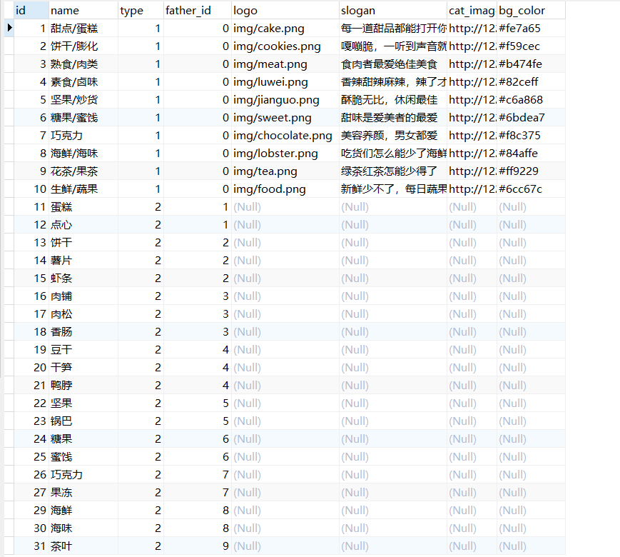 目录为甜点/蛋糕的id为1,而蛋糕和点心的father_id为1,目录为饼干/膨化的id为2,饼干、薯片、虾条的father_id就是2,一级目录id对应二级子目录的father_id,这就是所属对应关系,可以理解为父子关系。
