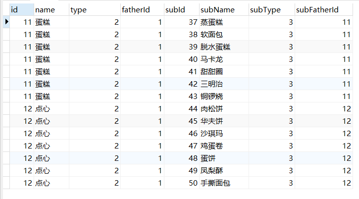 可以看到二级分类为蛋糕、点心时,有哪些对应的三级分类可以提供给前端,便于展示。