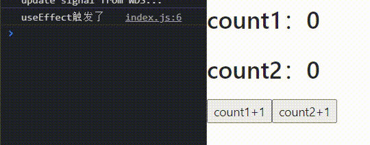 可以看到,只有绑定的count1发生变化才会触发,如果传空数组则任何状态发生变化都不会触发,此时useEffect的作用就类似class组件中的componentDidMount,所以发送请求通常也会在此执行。