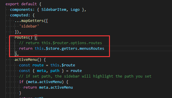 在路径src\layout\components\Sidebar\index.vue修改routes数据来源,原来数据源是路由,改为从vuex中获取。