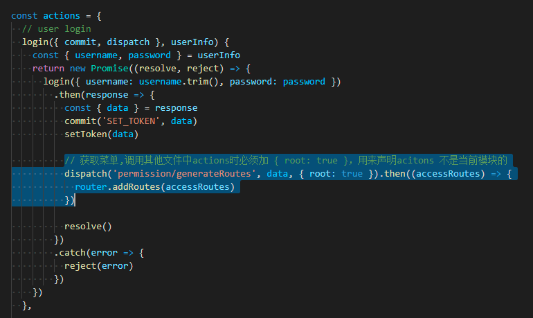 在vuex路径src\store\modules\user.js的login方法中,加入登陆成功通过token获取菜单生成路由逻辑。