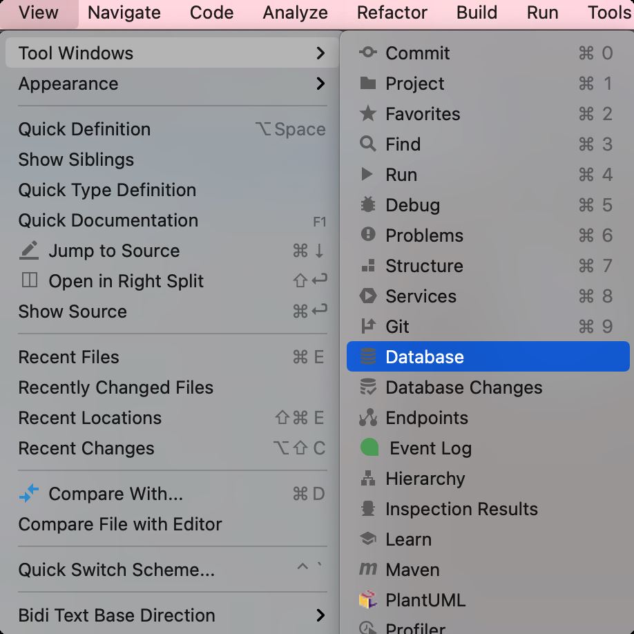 如果 IDEA 主页没有看到 Database 面板,可以在 View 菜单中依次调出 Database 菜单打开数据库工具面板。