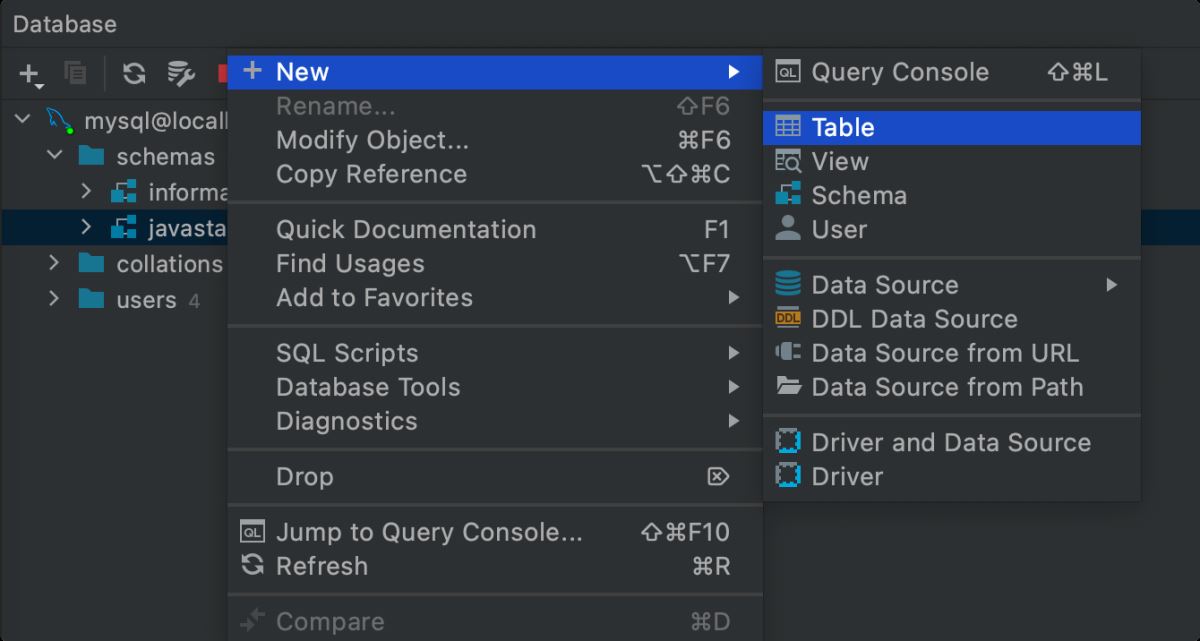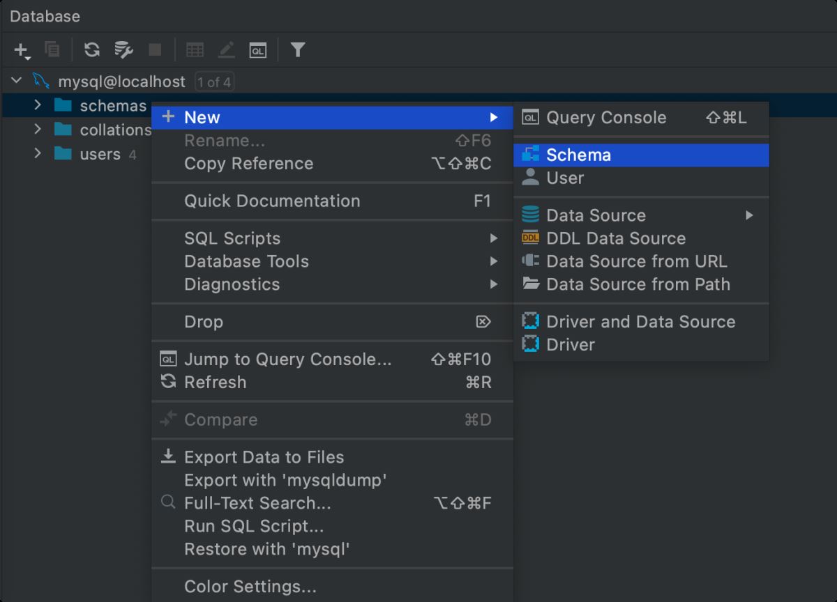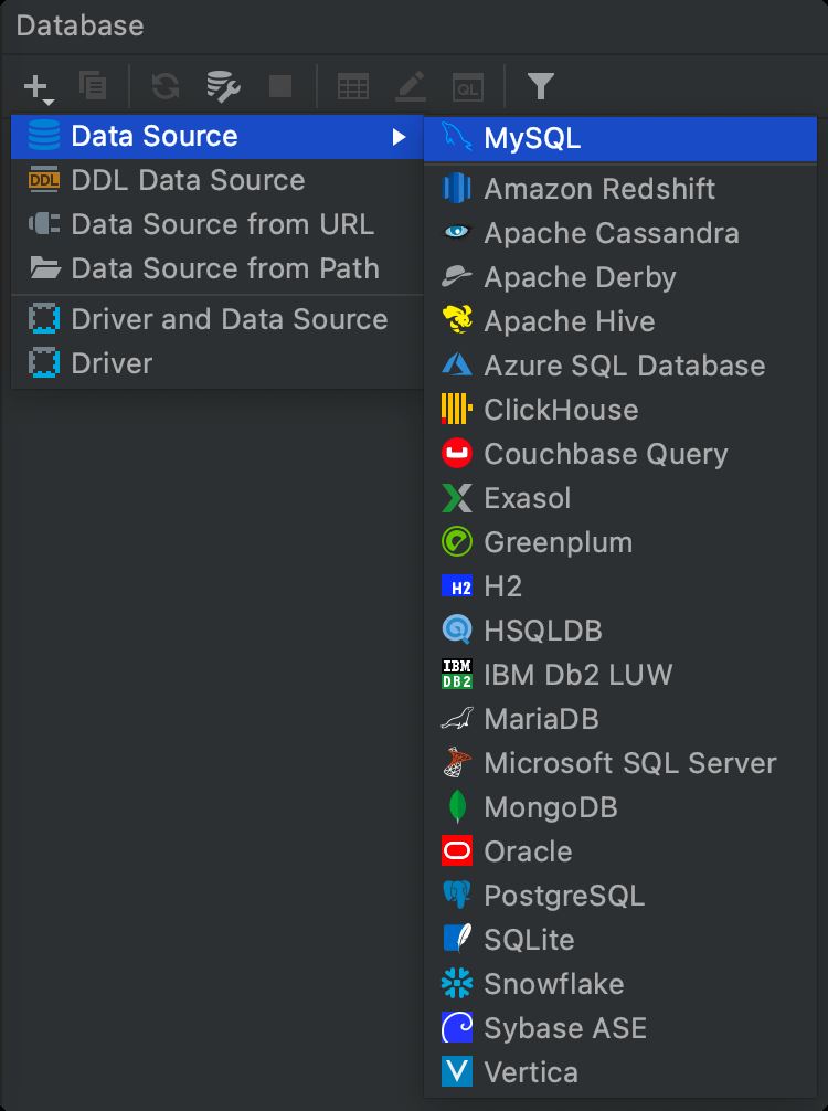 打开 Database 数据库面板后,点击 + 号根据提示选择对应的数据库创建一个数据源。