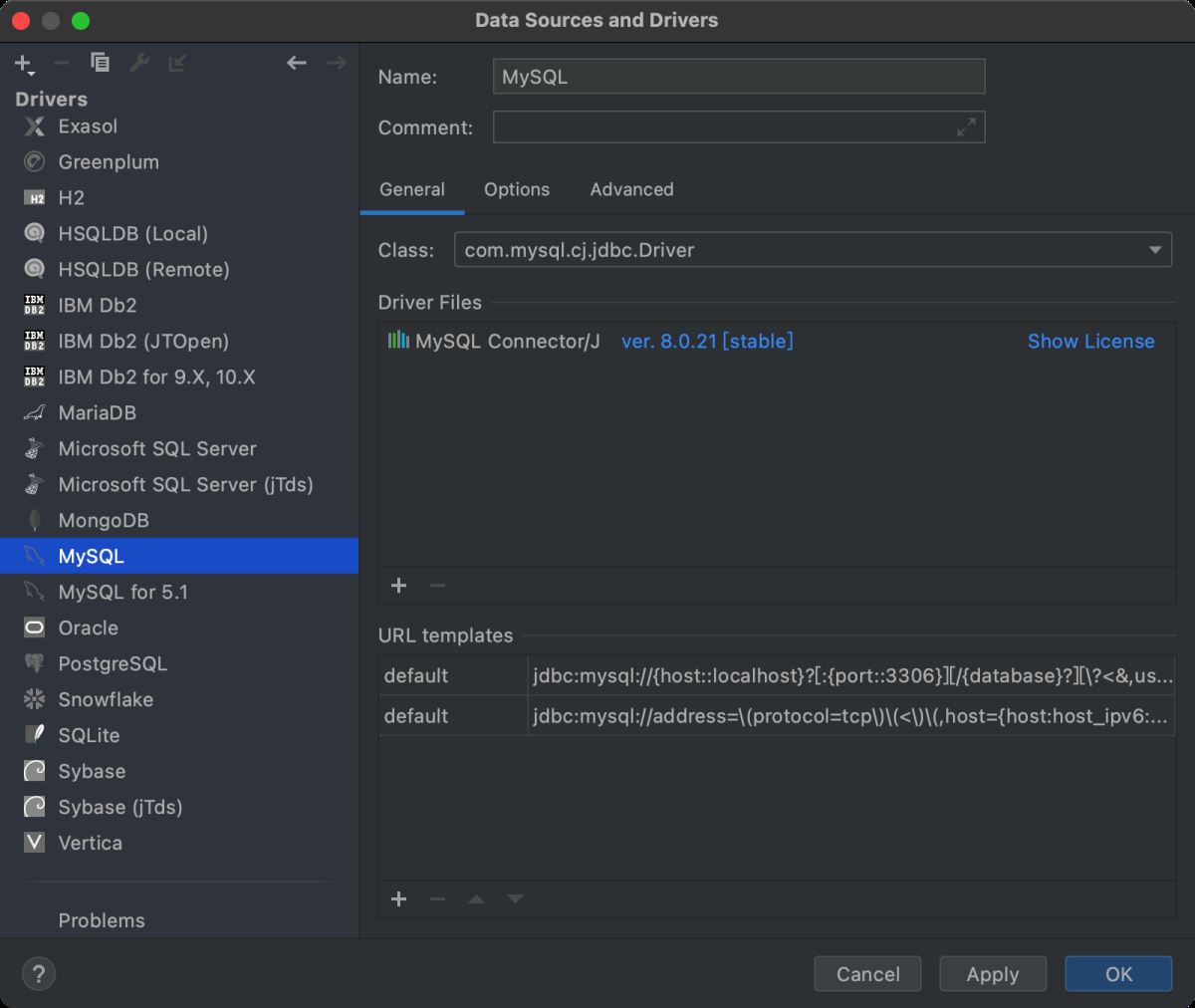 点击上面的 MySQL 驱动名称链接可以跳到对应的数据库驱动设置中: