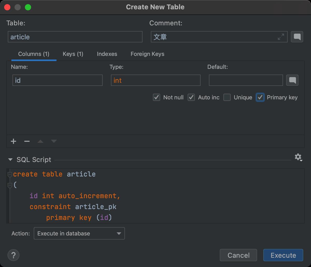 再点击 Execute 按钮在数据库中执行以创建一张表: