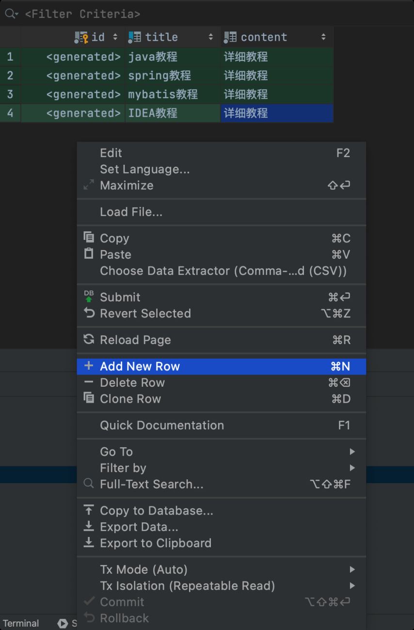 右键,点击 Add New Row 菜单依次添加几行新数据。