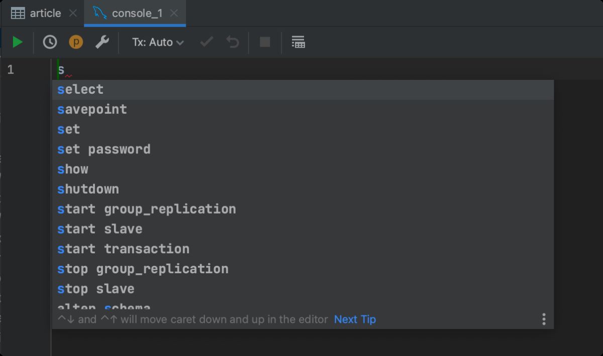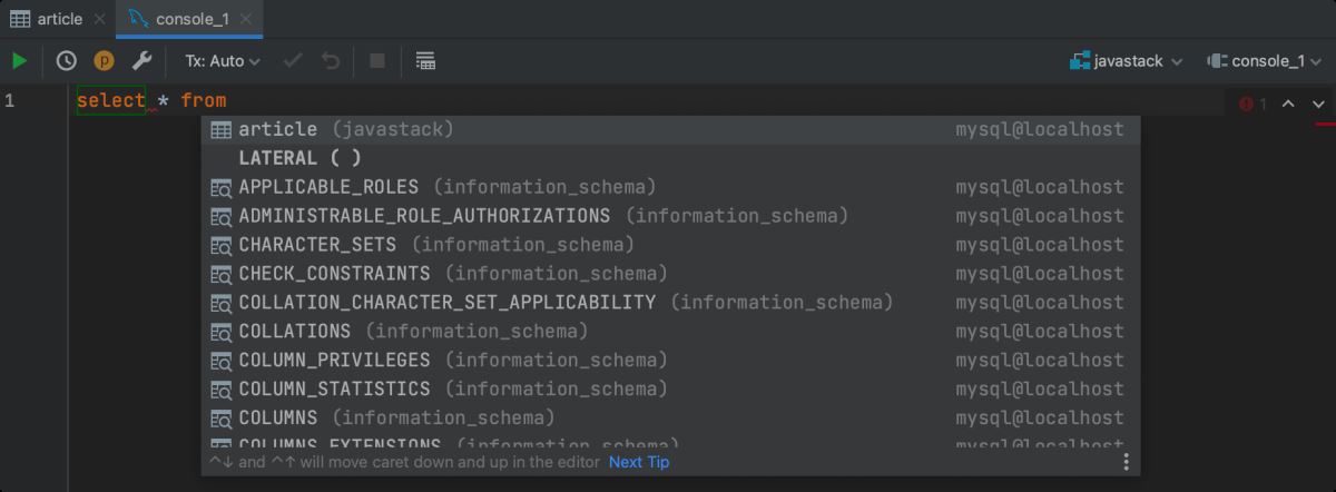 在查询控制台中输入 MySQL 关键字都会得到快捷智能提示: