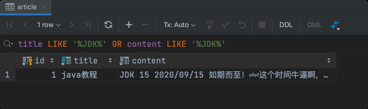 比如我要搜索 "JDK",条件中自动就把所有文本类型的字段自动带上了 like 条件: