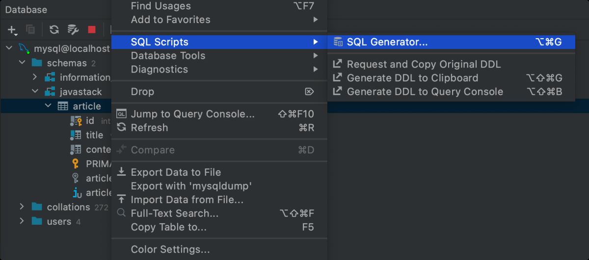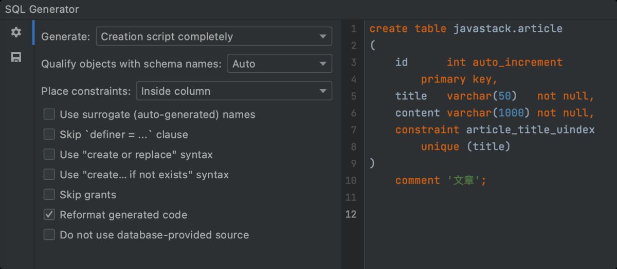 在已有的表上面还能进行 SQL 生成操作,如生成表创建 SQL 语句: