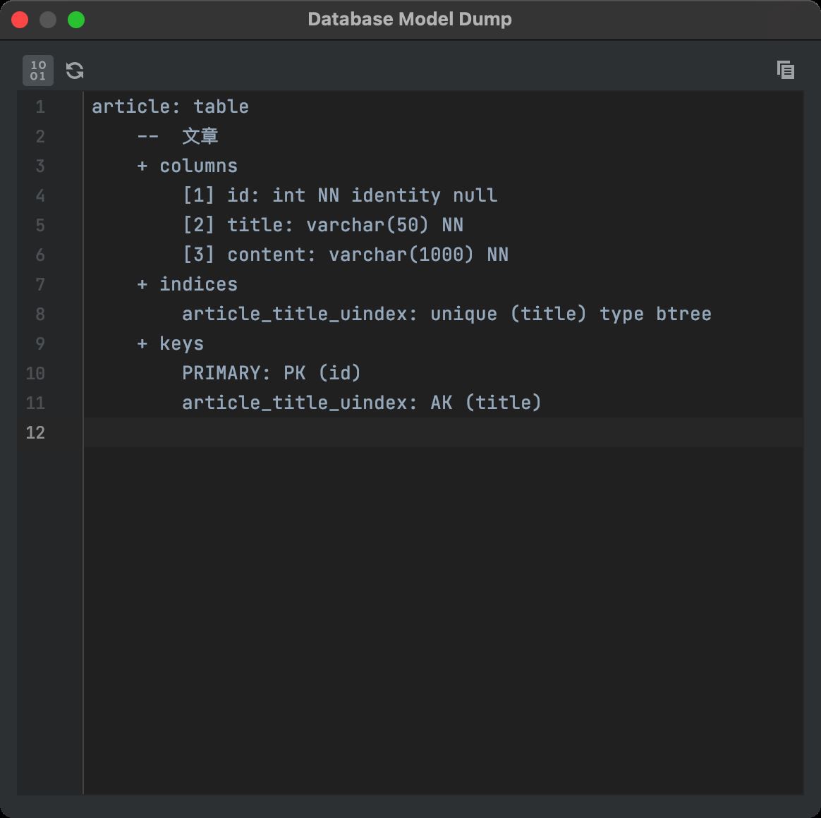 如下所示:这个模型信息虽然看起来很简陋,不能和 PowerDesigner 那么强大作比较,但也能把数据库所有信息很直观的列出来。