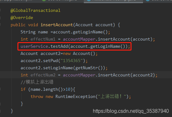 上游服务 coredata 使用seata全局事务注解@GlobalTransactional 标记方法,先插入一个Account数据 ;然后调用下游服务 usercent 插入一条数据;