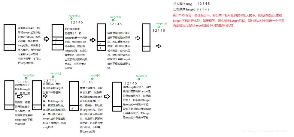 4、这时候如果target已经遍历完了,那么就说明了target就是msg的一种出栈可能,否则,如果target没有遍历完,说明target不是msg的一种出栈可能。