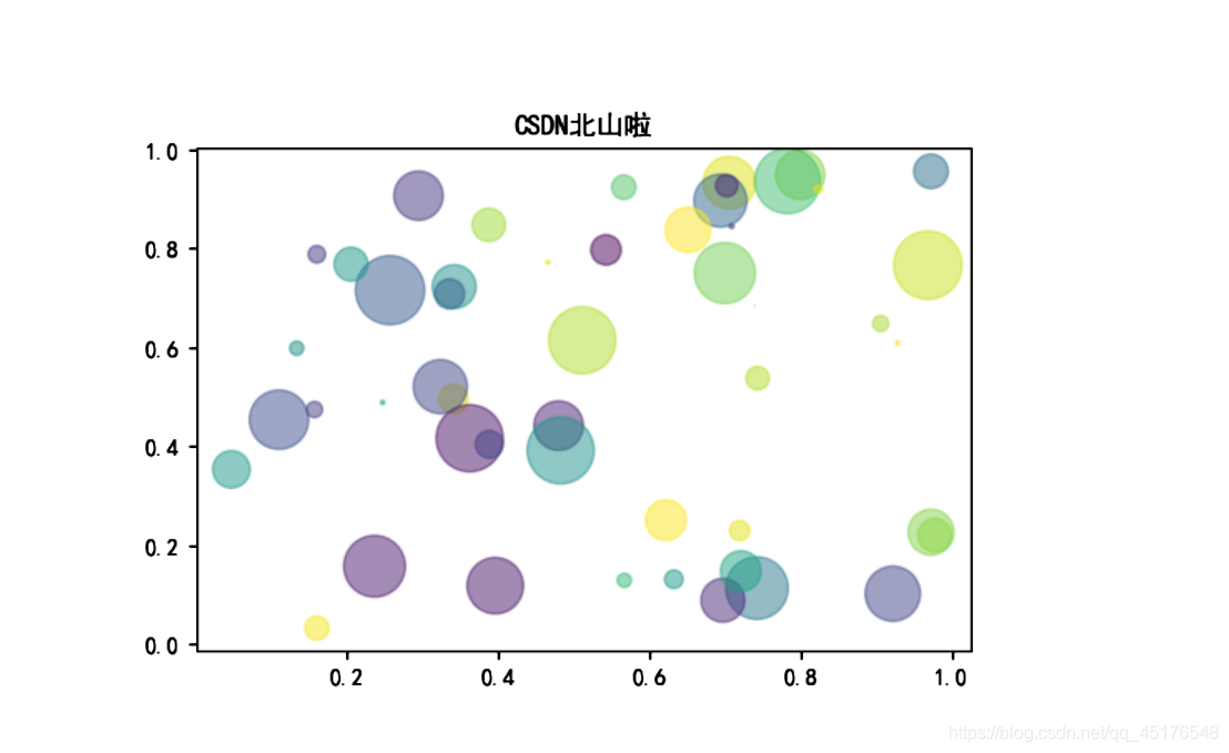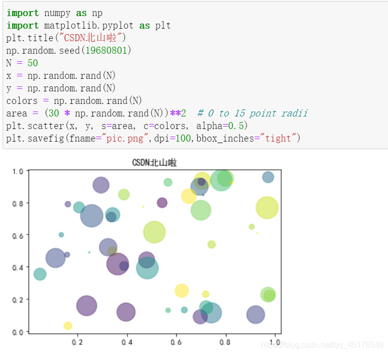 import numpy as np import matplotlib.pyplot as plt # Fixing random state for reproducibility np.random.seed(19680801) N = 50 x = np.random.rand(N) y = np.random.rand(N) colors = np.random.rand(N) area = (30 * np.random.rand(N))**2 # 0 to 15 point radii plt.scatter(x, y, s=area, c=colors, alpha=0.5) plt.show()