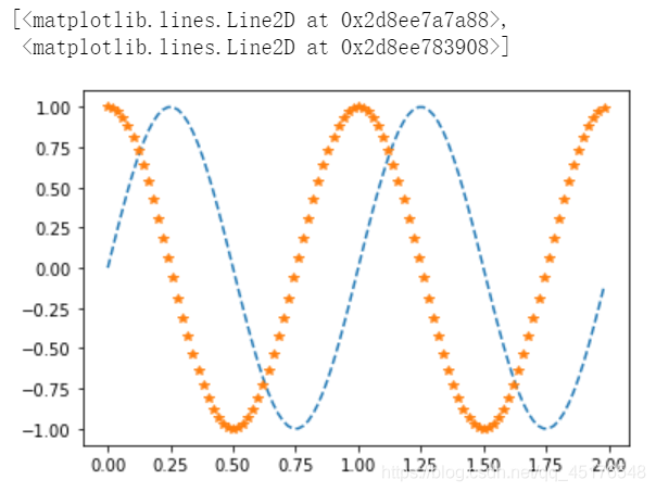 b = np.arange(0,2,0.02) plt.plot(b,np.sin(2*np.pi*b),'--',b,np.cos(2*np.pi*b),"*")