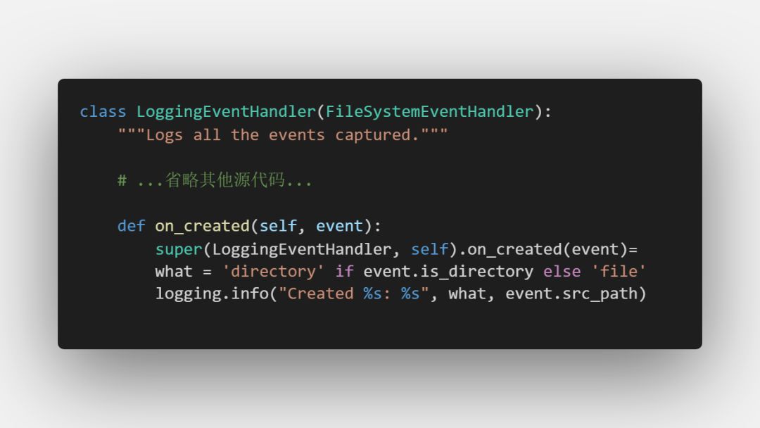 看看 LoggingEventHandler 源代码中的 on_created ,这就是当文件创建时监控器的操作: