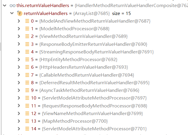 返回值处理器。ModelAndView、ResponseBody等。每个处理器处理不同类别的返回值类型。