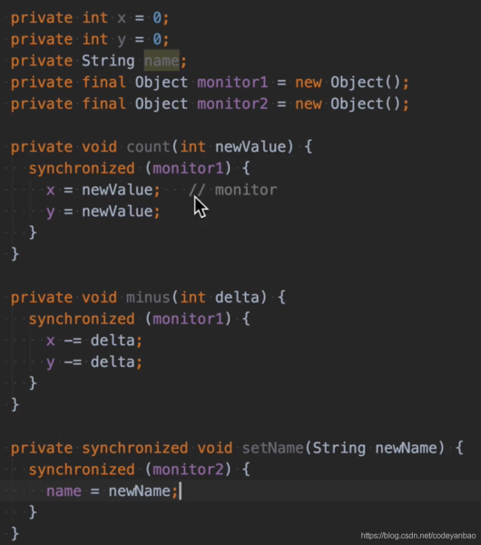 我们分别为setName();和其他两个方法指定了不同的monitor(监视器),这样当线程A访问上面两个方法的时候,线程B想访问方法setName也是不受影响的: